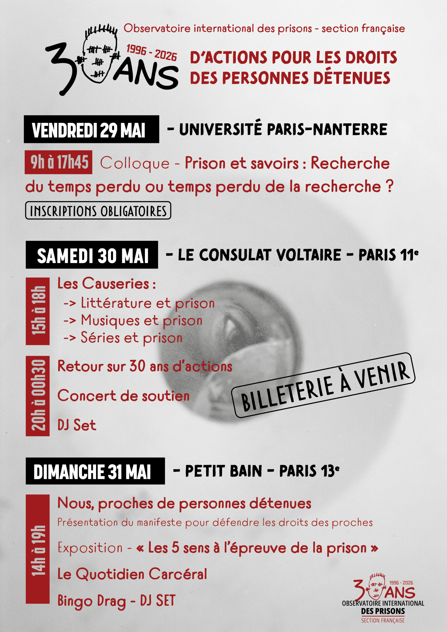 À l’occasion de ses 30 ans, l’Observatoire international des prisons – section française (OIP-SF) organise un week-end de rencontres et de mobilisations les 29, 30 et 31 mai 2026 à Paris. Trois journées ouvertes à toutes et tous pour revenir sur trois décennies d’actions, pour évoquer la situation des personnes détenues aujourd’hui, pour ouvrir des perspectives sur les enjeux actuels et à venir.